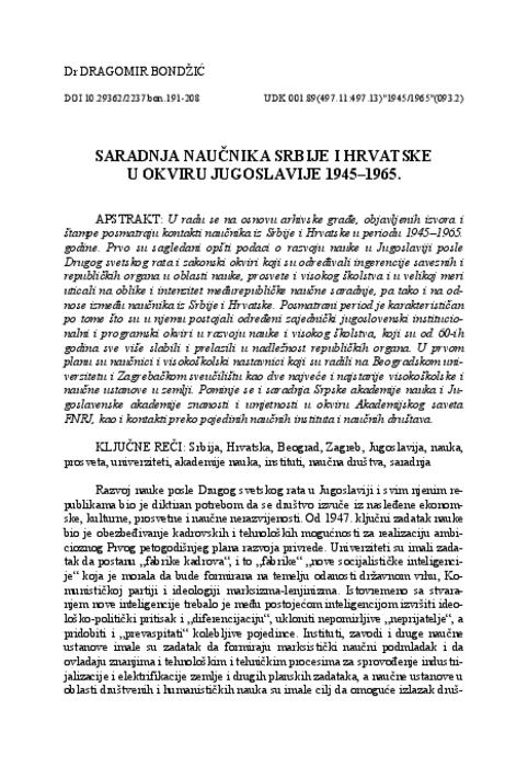 Bondžić, D. (2018). Saradnja naučnika Srbije i Hrvatske u okviru Jugoslavije 1945-1965. Jugoslavija-Između Ujedinjenja I Razlaza : Hrvatsko-Srpski Odnosi U Kontekstu Društvenog Razvoja Dve Jugoslavije 1918-1991, 191-208. doi:10.29362/2237.bon.191-208