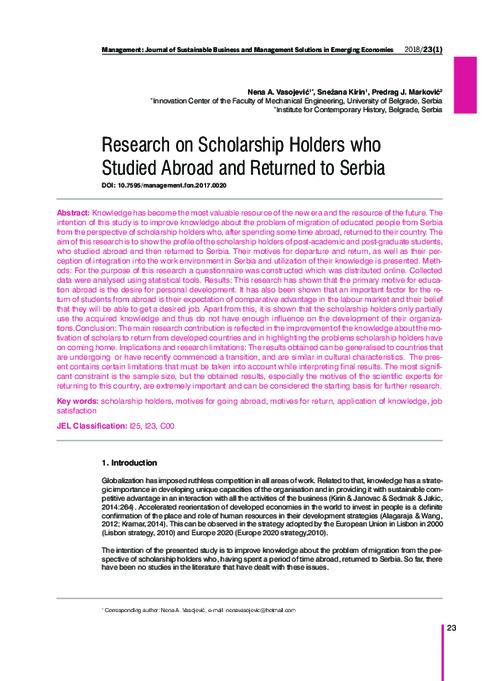 Vasojević, N. A., Kirin, S., & Marković, P. J. (2018). Research on Scholarship Holders who Studied Abroad and Returned to Serbia. Management: Journal Of Sustainable Business And Management Solutions In Emerging Economies, 23(1), 23-32. doi:10.7595/management.fon.2017.0020