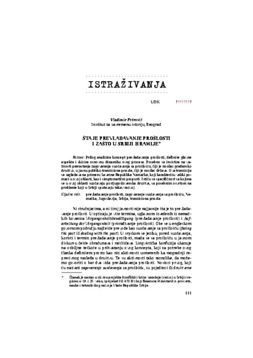 Prilog analizira koncept prevladavanja prošlosti, defi niše glavne aspekte i skicira osnovnu dinamiku ovog procesa. Posebno se insistira na važnosti prerastanja zagovaranja suočavanja sa prošlošću, čiji je nosilac građansko društvo, u jasnu politiku tranzicione pravde, čiji je nosilac država. Ova tranzicija se sagledava na primeru Savezne Republike Nemačke, koji karakterišu veliki pomaci u ovoj oblasti, kao i simptomatični propusti. Ističu se specifi čnost sa kojima se u ovoj oblasti suočavaju postjugoslovenska društva, sa posebnim osvrtom na probleme koji u Srbiji sputavaju takav razvoj.