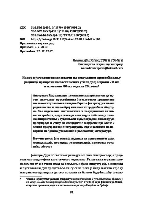 Добривојевић Томић, И. (2018). Напори југословенских власти на сексуалном просвећивању радница привремено настањених у западној Европи 70-их и почетком 80-их година 20. века. Токови Историје, (1), 81-100. doi:https://doi.org/10.31212/tokovi.2018.1.dob.81–100