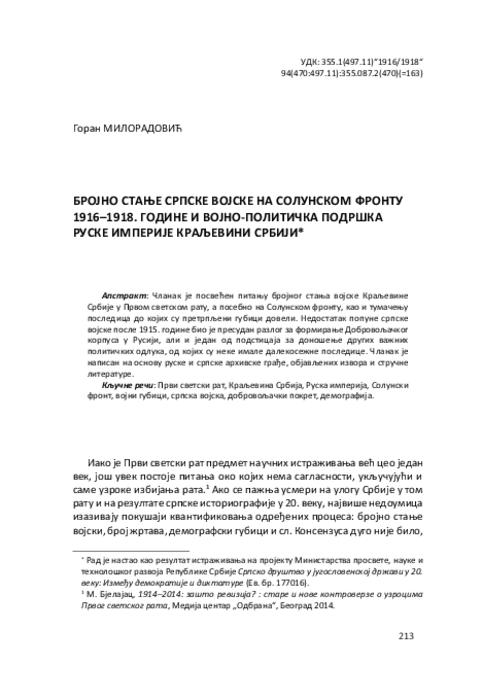 Чланак је посвећен питању бројног стања војске Краљевине Србије у Првом светском рату, а посебно на Солунском фронту, као и тумачењу последица до којих су претрпљени губици довели. Недостатак попуне српске војске после 1915. године био је пресудан разлог за формирање Добровољачког корпуса у Русији, али и један од подстицаја за доношење других важних политичких одлука, од којих су неке имале далекосежне последице. Чланак је написан на основу руске и српске архивске грађе, објављених извора и стручне литературе.